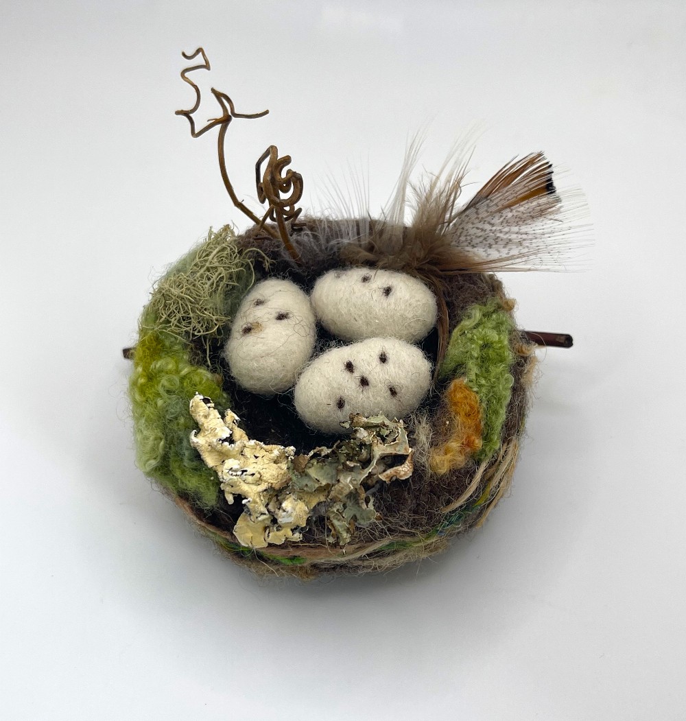 This Felted Nest was made by artist Libby Mortensen. It has a 3" diameter and is about 3" tall.