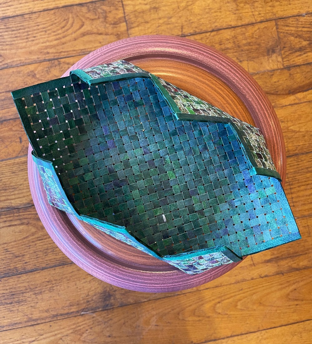 This woven paper tray was made by Ruth Boland. It measures 12"L x 6.5"W x 3.25"H.