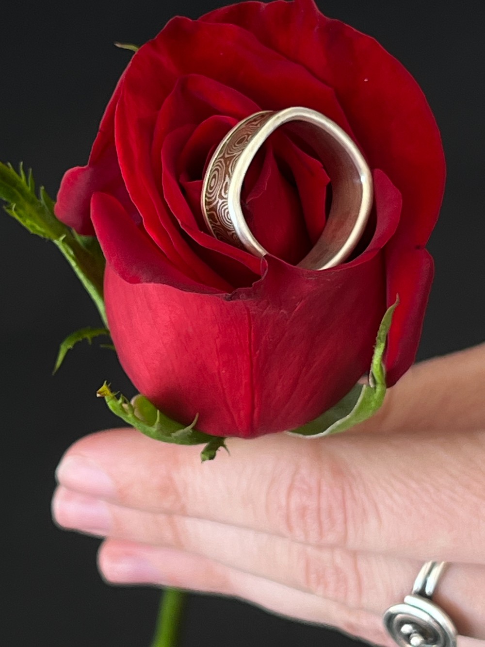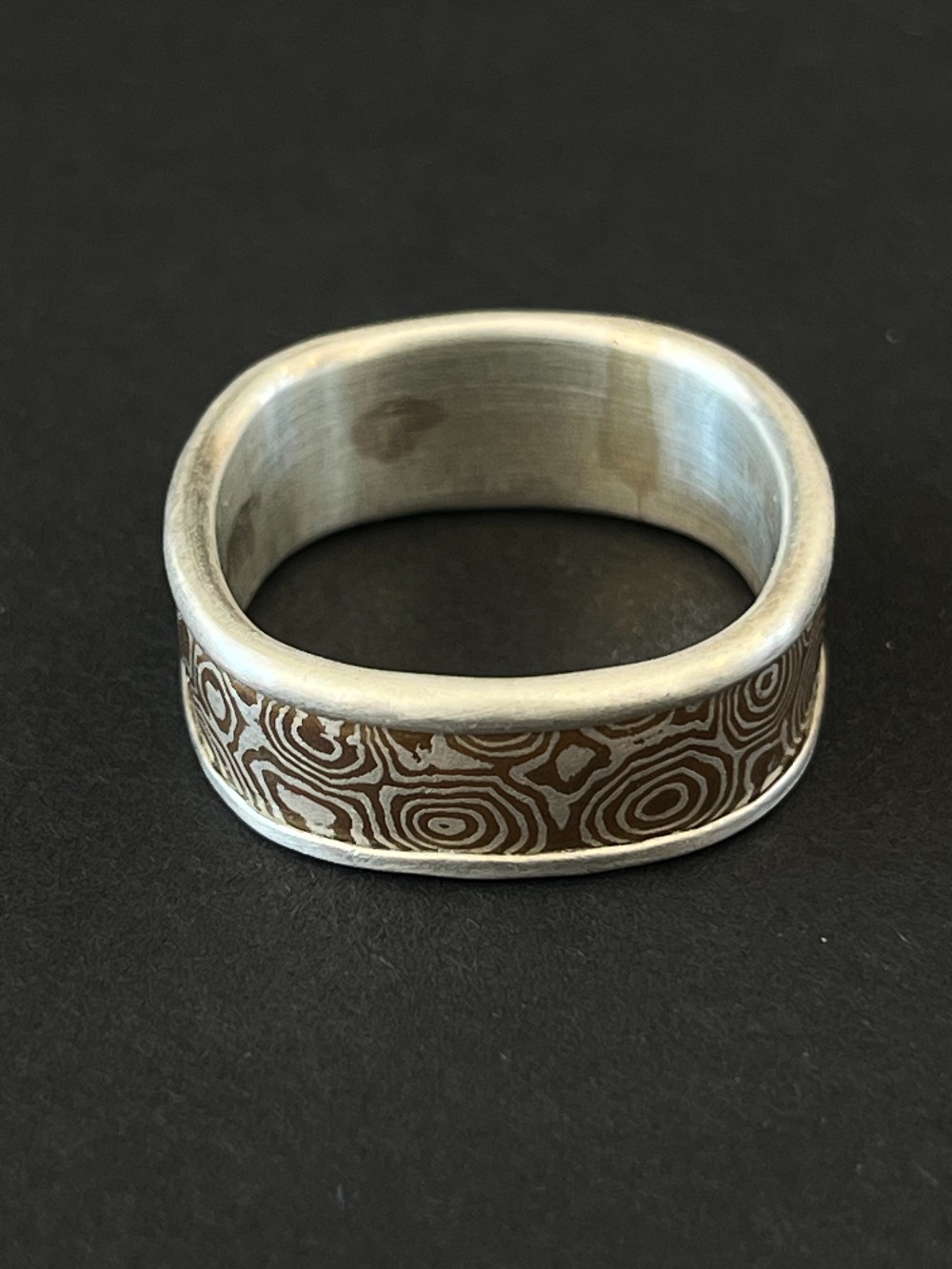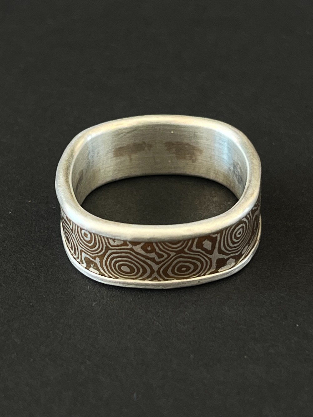 Mokume Gane, or wood grain metal, is a traditional Japanese technique in which two or more different metals are alternately stacked, compressed and heated to a high temperature creating a beautiful swirled marriage of the different metals.